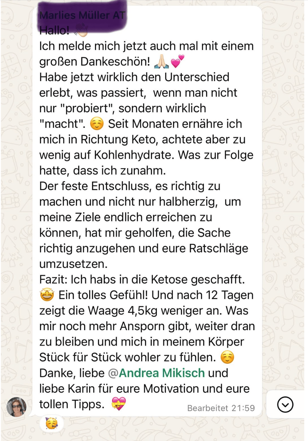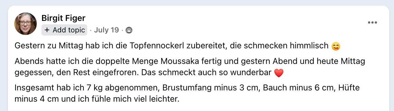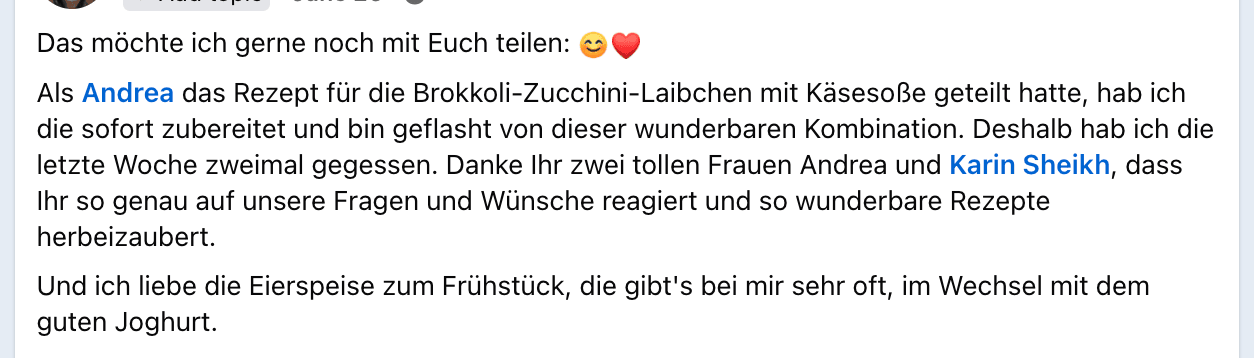 Ich kann mit voller Überzeugung sagen: Ich habe mich noch nie so wohl in meinem Körper gefühlt wie jetzt! Ich habe viele Ernährungsformen ausprobiert und immer mit regelmäßigem Sport kombiniert, der gewünschte Erfolg blieb aber aus. Besonders die Definition meines Körpers ließ auf sich warten – trotz Disziplin. Nach 4 Monaten Anleitung von Andrea & Karin ist meine Periode wieder regelmäßig – und das ganz ohne Heißhunger auf Süßes! Mein Energielevel ist spürbar gestiegen, das hartnäckige Bauchfett hat sich verabschiedet, und ich habe endlich Freude am Kochen. Die Rezepte von Andrea und Karin sind nicht nur einfach und alltagstauglich, sondern auch unglaublich lecker. Ich bin so dankbar, diesen Weg gefunden zu haben!